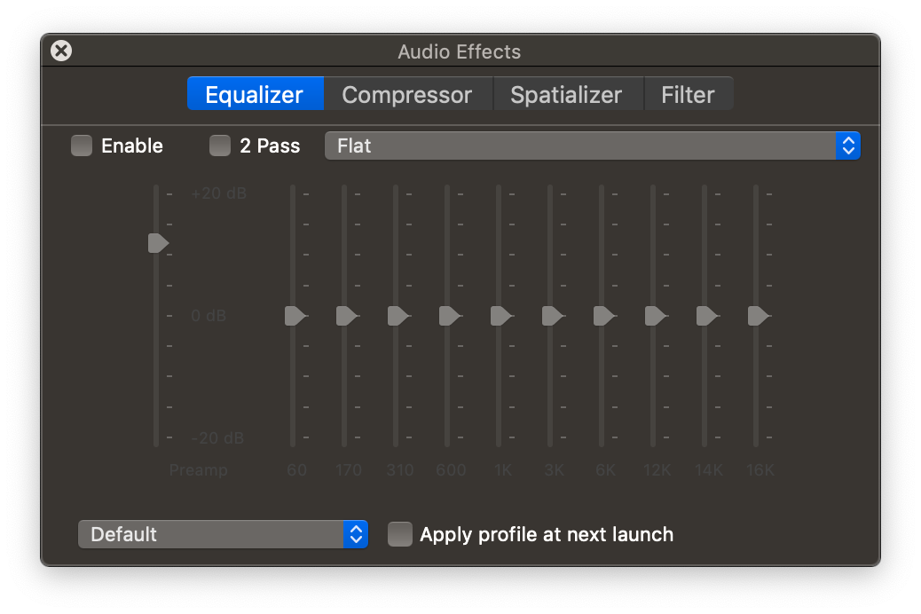 Die Registerkarten repräsentieren Equalizer, Compressor, Spatializer und Filter. Damit können wir Audiospuren auf einfache weise manipulieren.