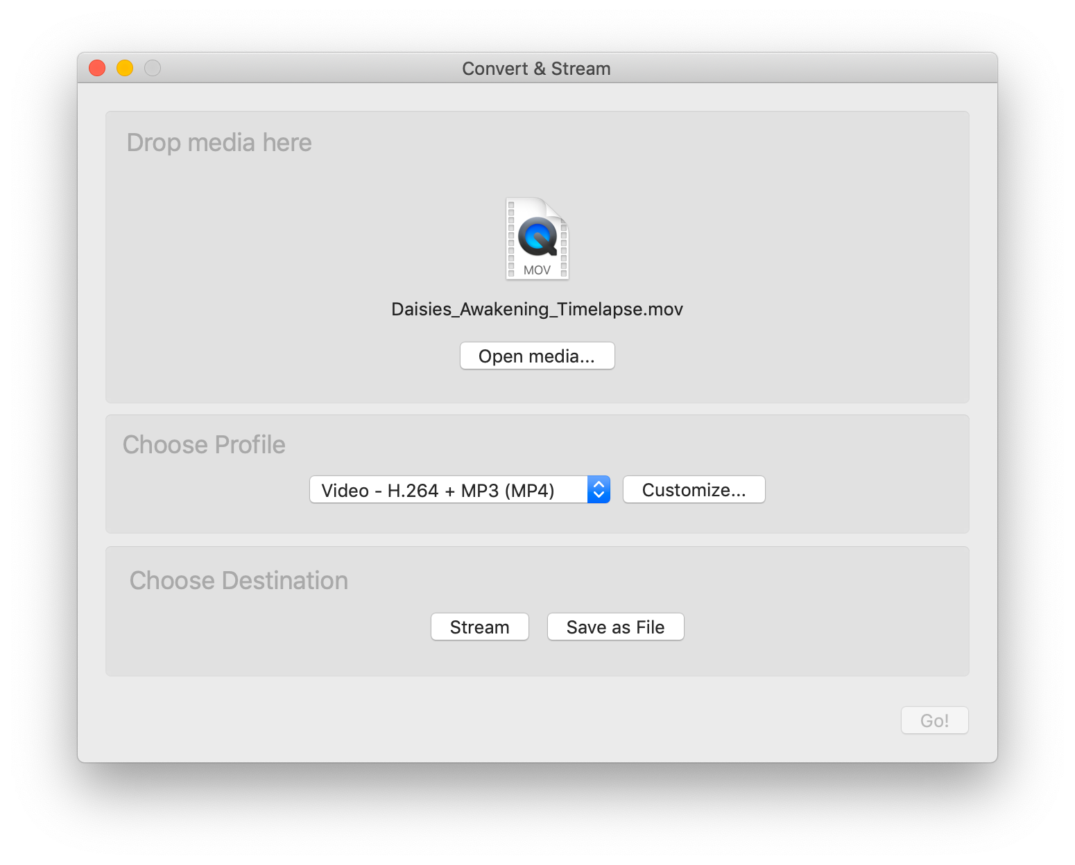 Anschliessend rufen wir den Menüpunkt (Ablage > Konvertieren / Streamen) (Convert & Stream) auf.