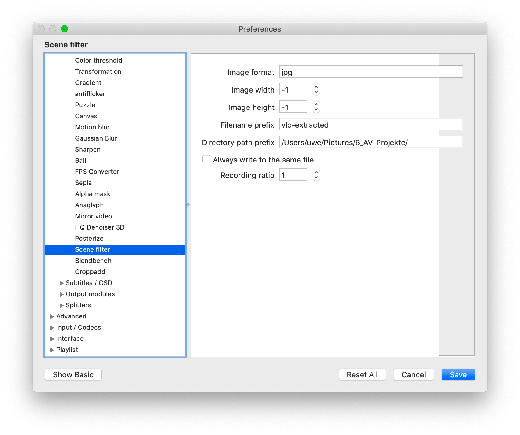 Speicherung von Frames als Bilder konfigurieren (Szenen-Filter)