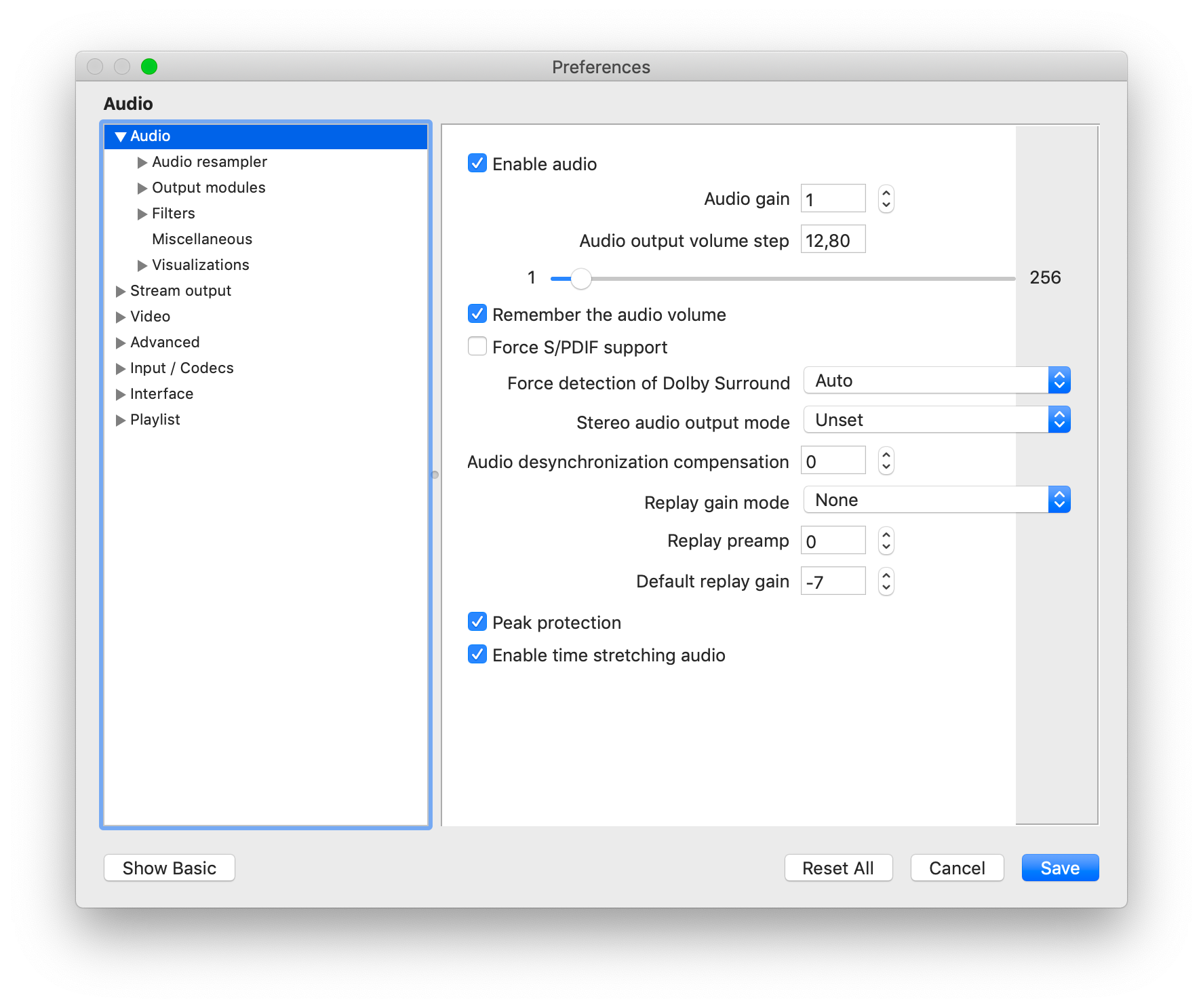 [Alle einblenden] (Preferences, Show All) führt uns in einen Dialog, der die weitreichende Konfiguration von VLC auf Basis einer Baumstruktur zulässt.