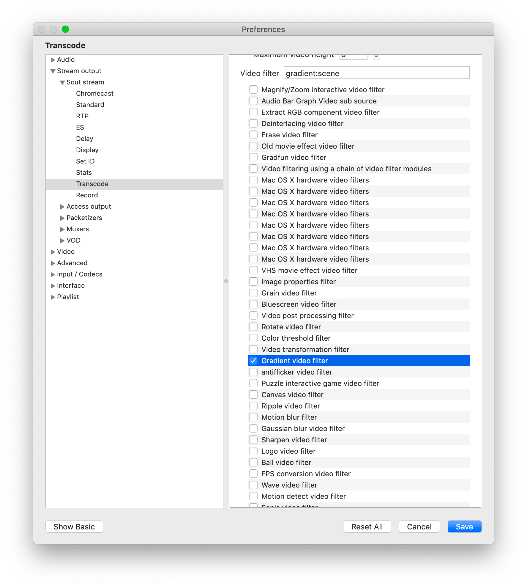Die unter den Kapiteln Video mit Filtereffekten anzeigen und Sound eines Videos optimieren beschriebenen Filter sind ebenfalls in den Grundeinstellungen für das Streaming bzw. Speichern zur Transkodierung zu aktivieren (Beispiel siehe der oben: Filter gradient).