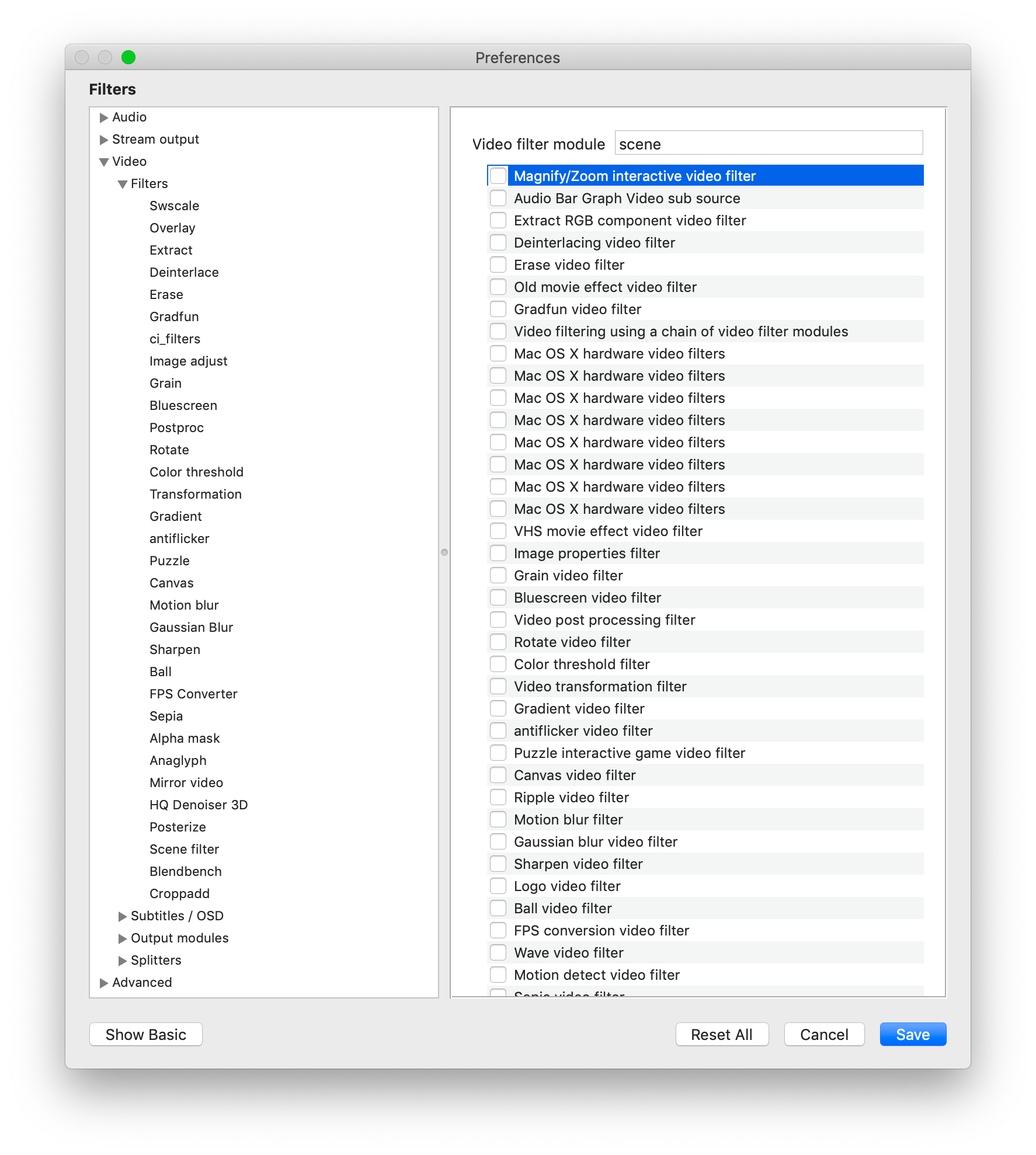 Bei Auswahl des Knotens Video > Filter können in der rechts erscheinenden Liste Filter für die Video-Ausgabe durch Setzen eines Häkchens aktiviert werden.