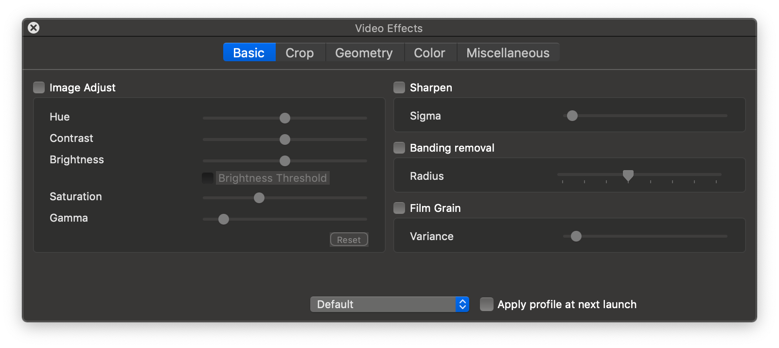 Es gibt viele Möglichkeiten die Darstellung des Videos zu beeinflussen. Mit Aufruf des Menüs (Fenster > Videoeffekte ...) (Window > Video Effects) erscheint ein Fenster mit den Registerkarten Basis (Basic), Beschneiden (Crop), Geometrie (Geometry), Farbe (Color) und Verschiedenes (Miscellaneous). Angeboten werden einfache Standardanpassungen bis hin zu deutlich verfälschenden Effekten.