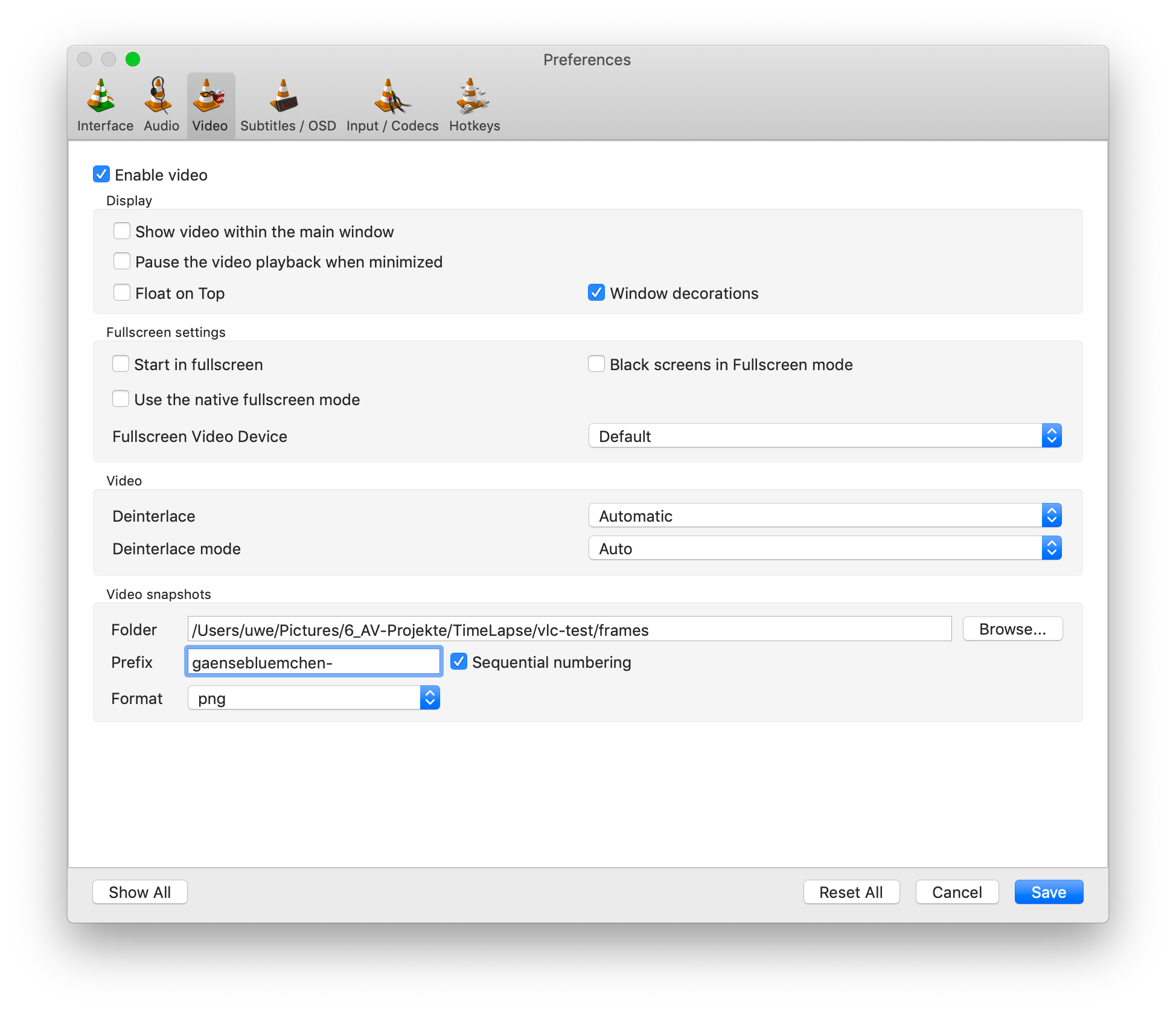 Soll ein Video, oder dessen Frames als Bilder gespeichert werden, sind Anpassungen in den Grundeinstellungen (Preferences) erforderlich. Das folgende Bild zeigt den Basisdialog. Wir können ihn über (VLC > Einstellungen) aufrufen.